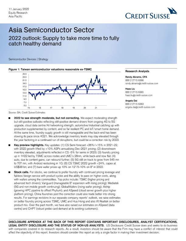 【瑞信(Credit Suisse)】【20220111】瑞信-亚太地区半导体行业-2022年展望:供应需要更多时间才能完全赶上稳健需求-56页