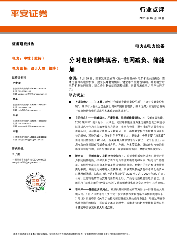 【平安证券】【20210730】电力&电力设备:分时电价削峰填谷,电网减负、储能加-3页