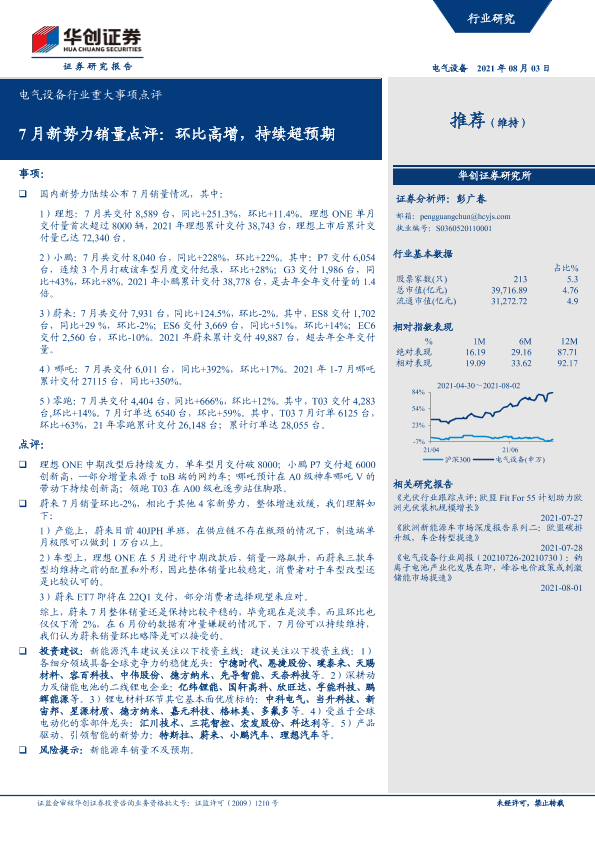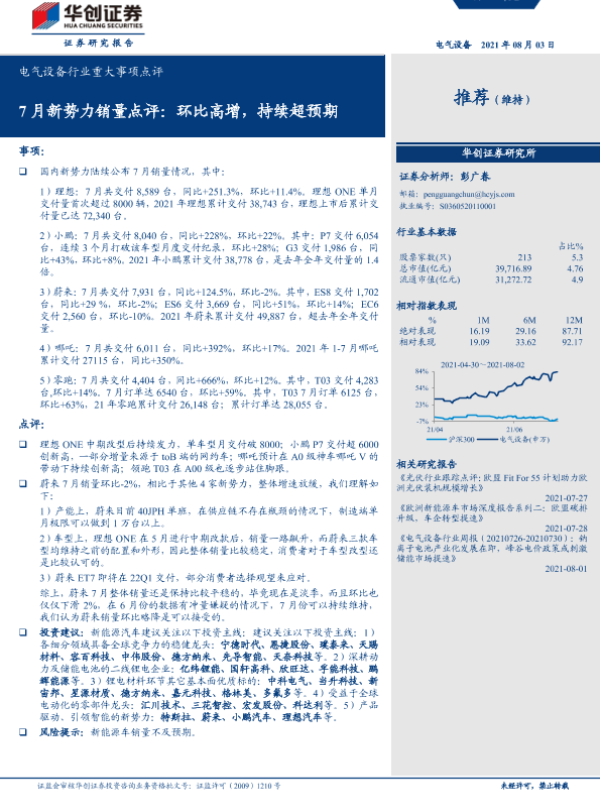 【华创证券】【20210803】电气设备行业重大事项点评:7月新势力销量点评:环比高增,持续超预期-4页