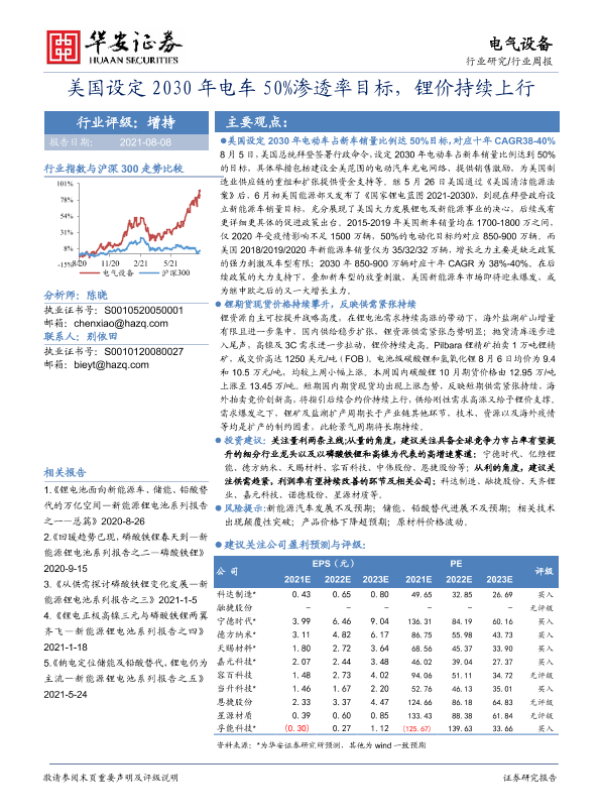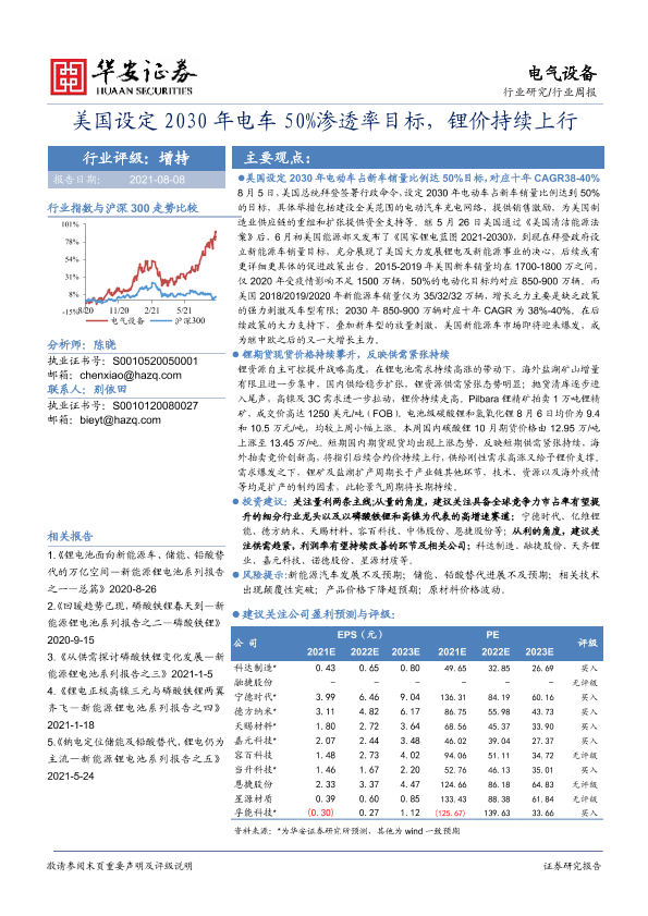 【华安证券】【20210808】美国设定2030年电车50%渗透率目标,锂价持续上行-24页