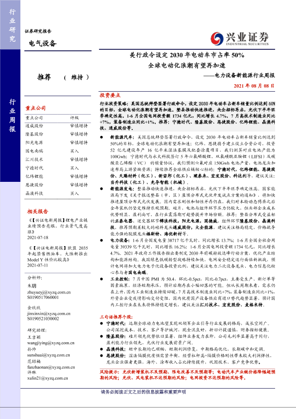 【兴业证券】【20210808】美行政令设定2030年电动车市占率50% 全球电动化浪潮有望再加速——电力设备新能源行业周报-26页