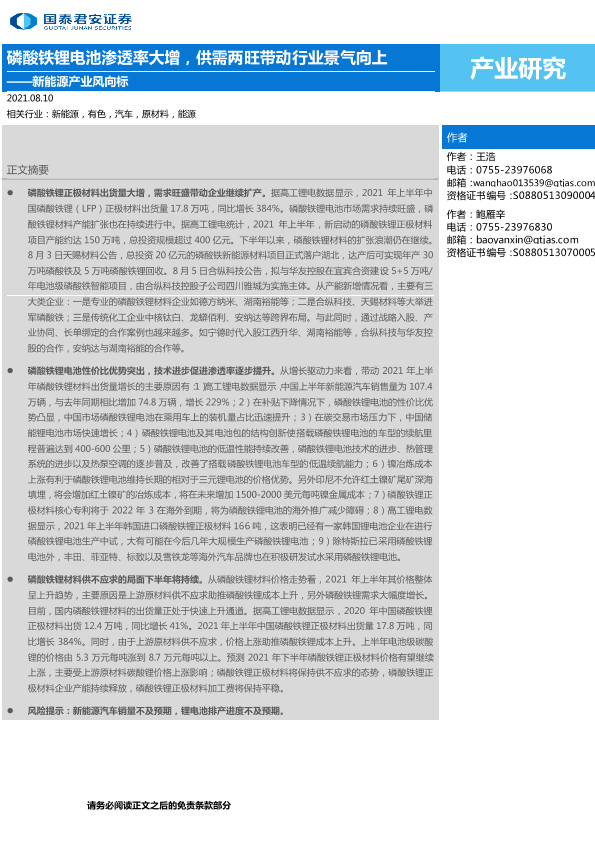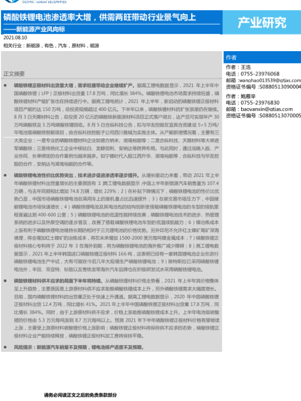 【国泰君安证券】【20210810】新能源产业风向标:磷酸铁锂电池渗透率大增,供需两旺带动行业景气向上-2页