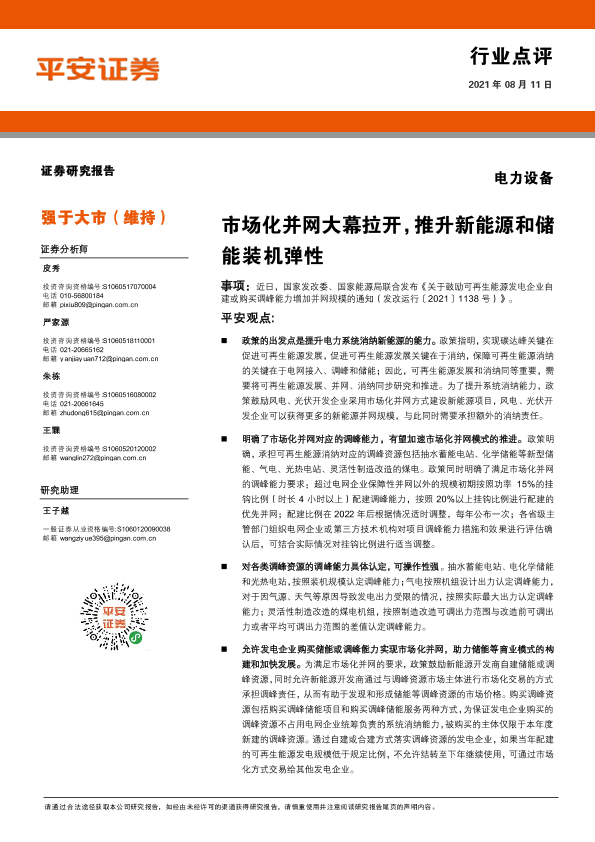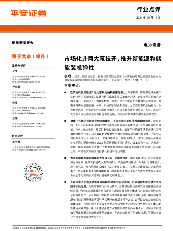 【平安证券】【20210811】电力设备:市场化并网大幕拉开,推升新能源和储能装机弹性-3页