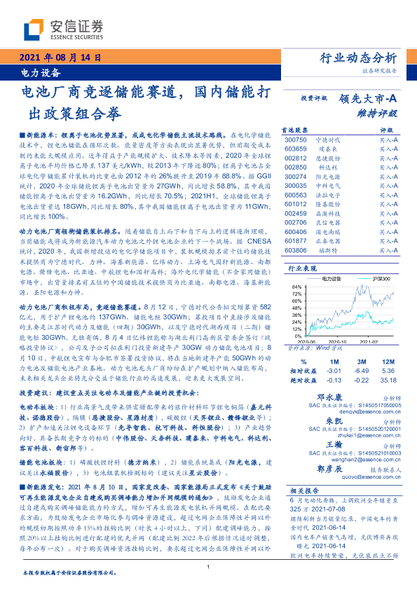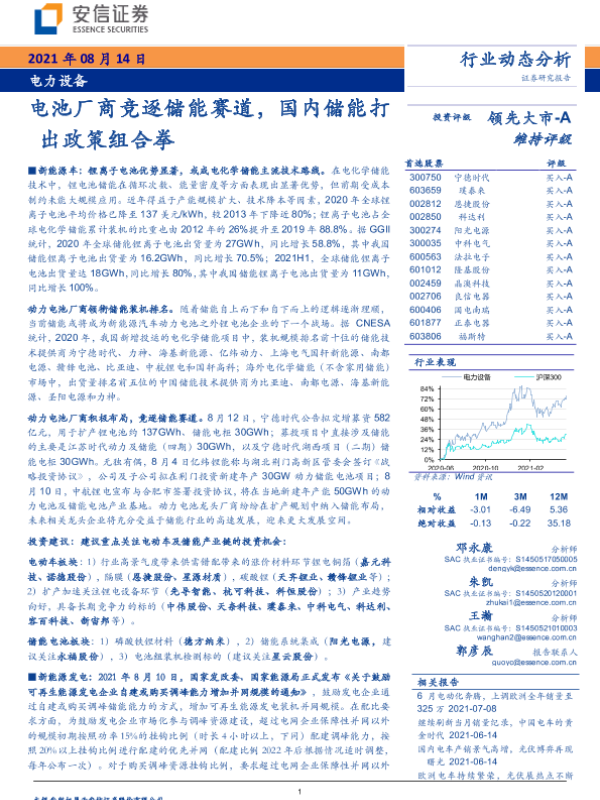 【安信证券】【20210814】电池厂商竞逐储能赛道,国内储能打出政策组合拳-29页