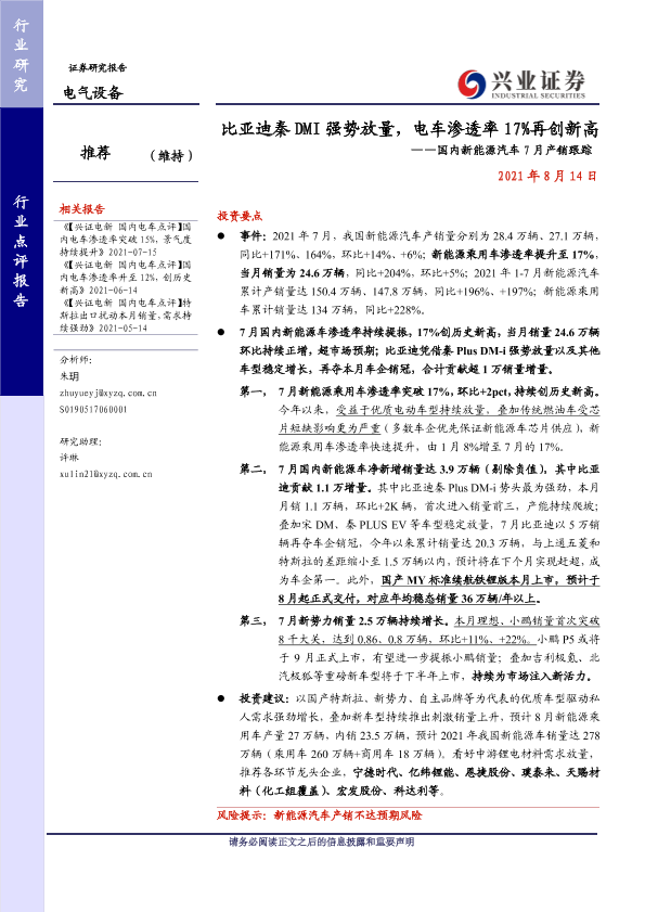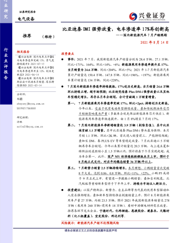 【兴业证券】【20210814】比亚迪秦 DMI强势放量,电车渗透率 17%再创新高——国内新能源汽车 7月产销跟踪-13页