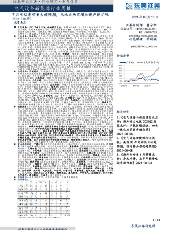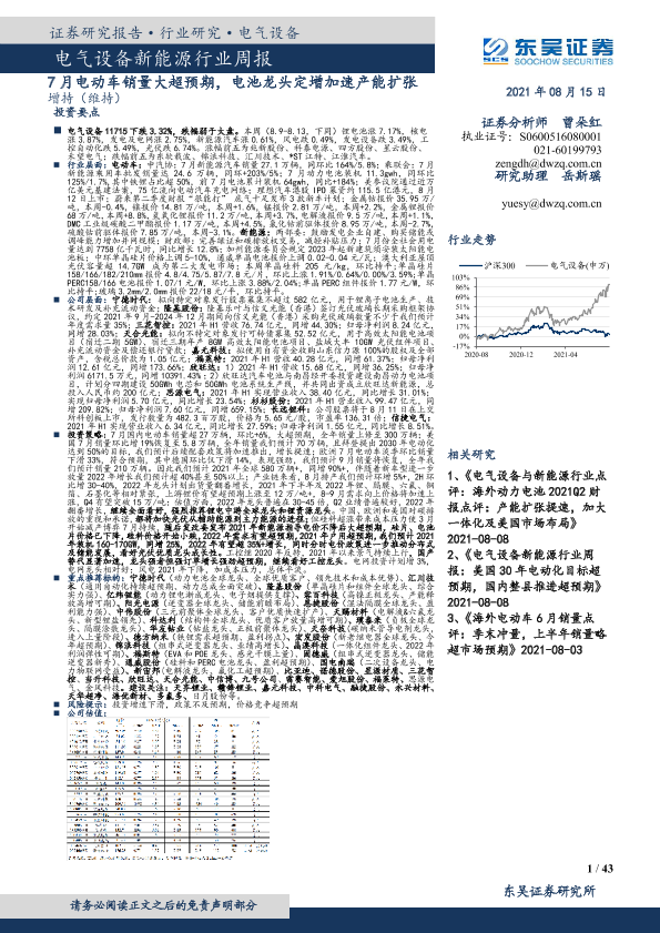 【东吴证券】【20210815】电气设备新能源行业周报:7月电动车销量大超预期,电池龙头定增加速产能扩张-43页