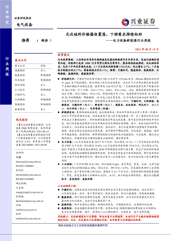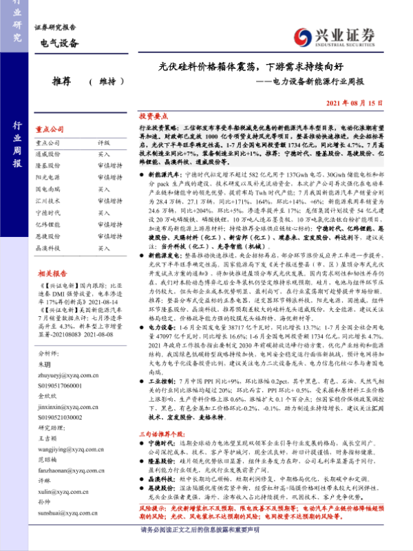 【兴业证券】【20210815】光伏硅料价格箱体震荡,下游需求持续向好——电力设备新能源行业周报-27页