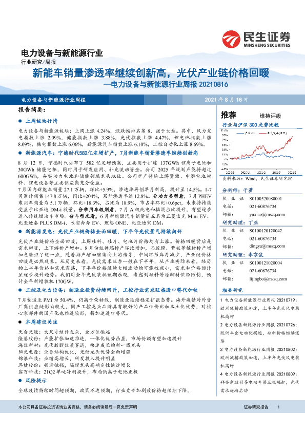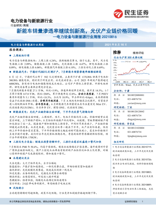 【民生证券】【20210816】电力设备与新能源行业周报:新能车销量渗透率继续创新高,光伏产业链价格回暖-22页