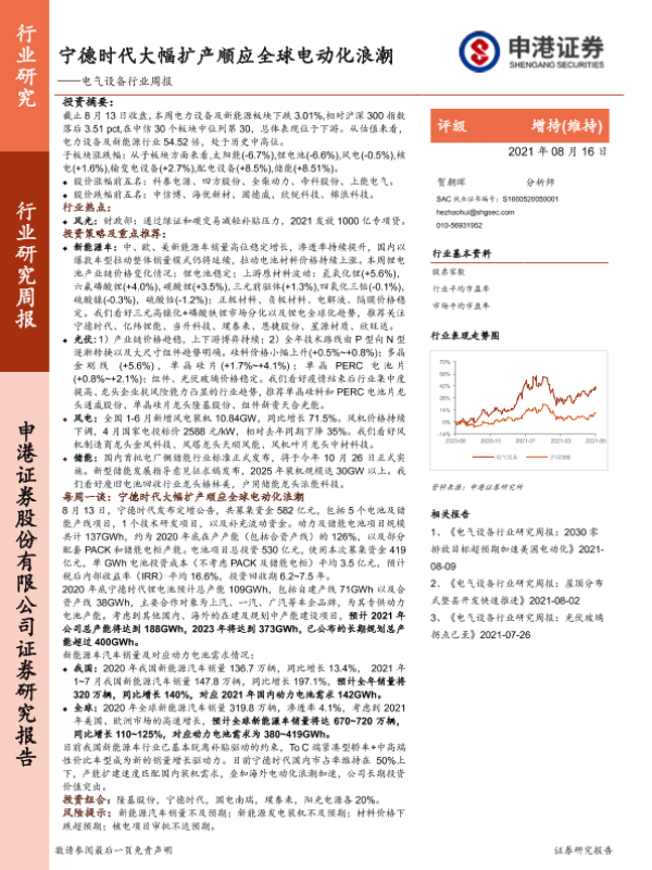【申港证券】【20210816】电气设备行业周报:宁德时代大幅扩产顺应全球电动化浪潮-42页