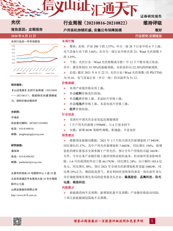 【山西证券】【20210822】20210822-山西证券-光伏行业周报:户用装机持续旺盛,安徽公布保障规模-10页