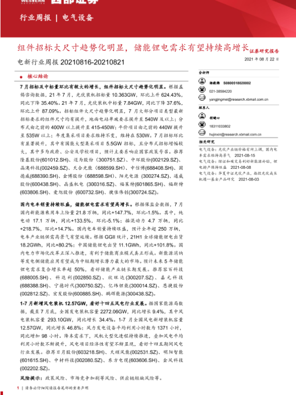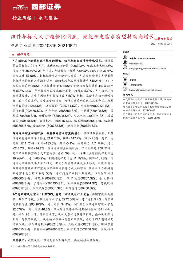 【西部证券】【20210822】电新行业周报:组件招标大尺寸趋势化明显,储能锂电需求有望持续高增长-14页