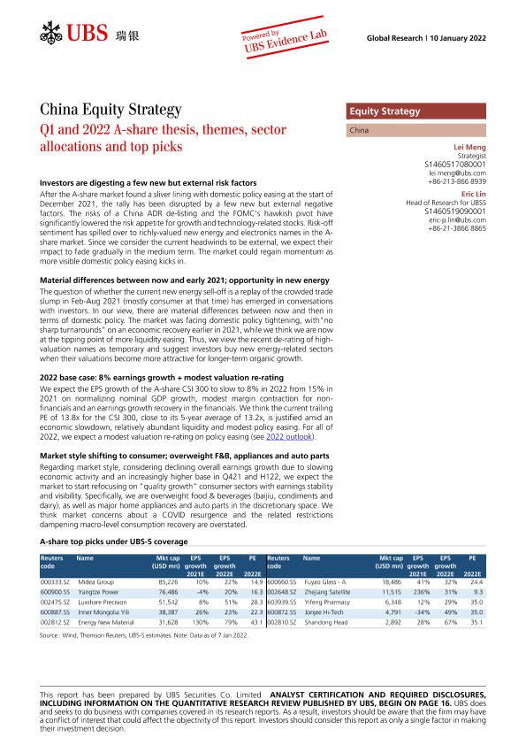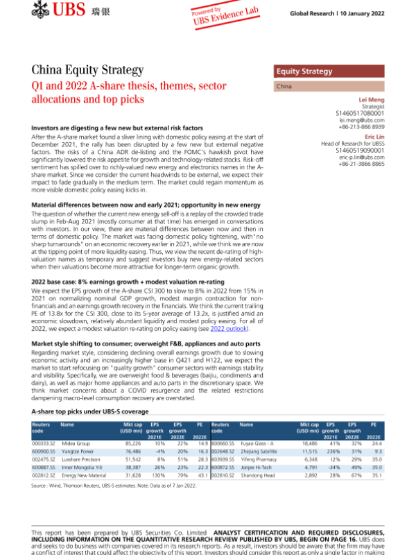 【瑞银】【20220110】瑞银-中国投资策略-第一季度和2022年A股论文、主题、行业配置和最佳选择-21页
