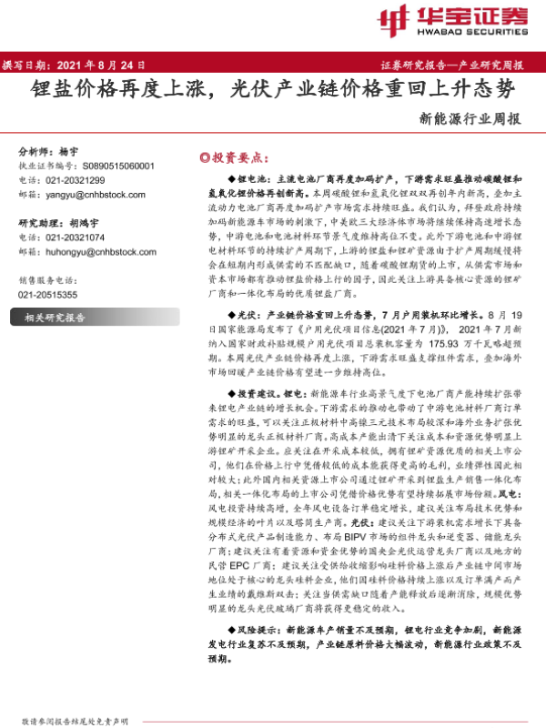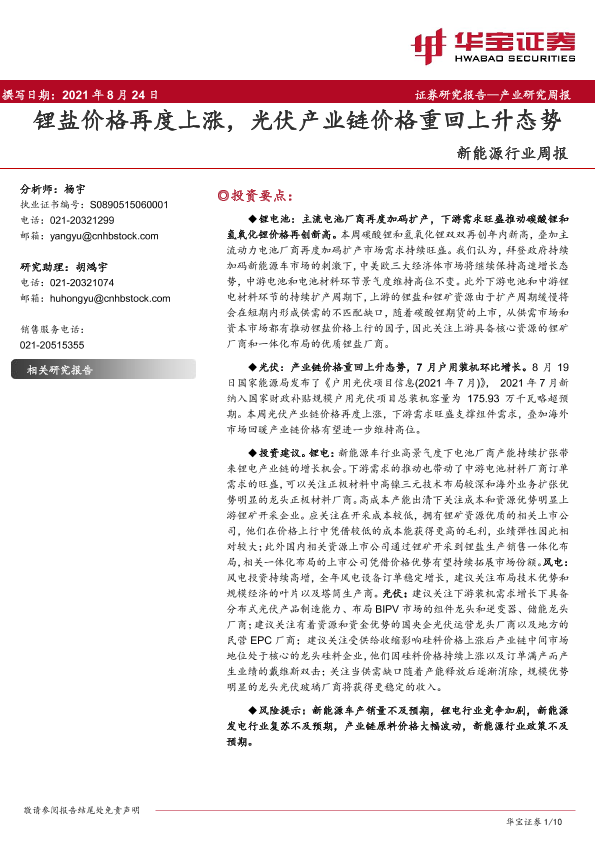 【华宝证券】【20210824】20210824-华宝证券-新能源行业周报:锂盐价格再度上涨,光伏产业链价格重回上升态势-10页
