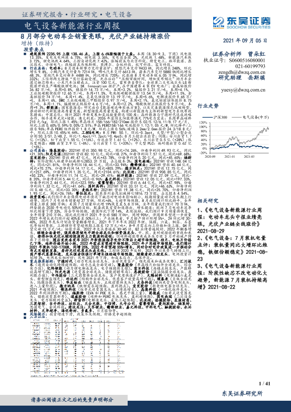 【东吴证券】【20210905】电气设备新能源行业周报:8月部分电动车企销量亮眼,光伏产业链持续涨价-41页