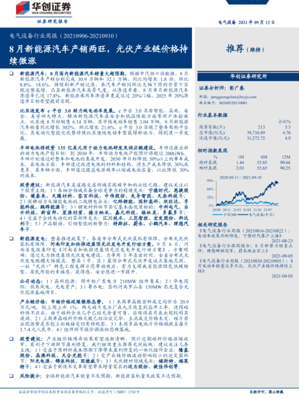 【华创证券】【20210912】电气设备行业周报:8月新能源汽车产销两旺,光伏产业链价格持续微涨-21页