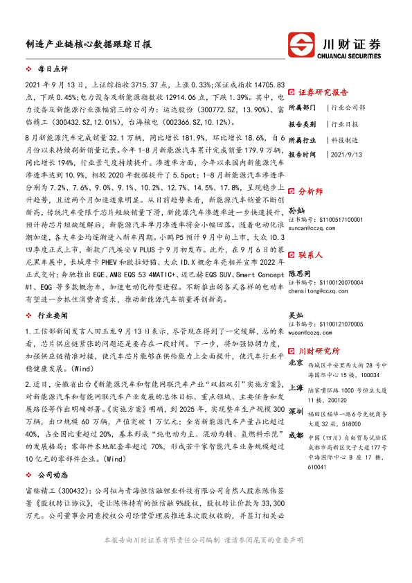 制造产业链 川财证券 行业日报 锂电池 新能源汽车