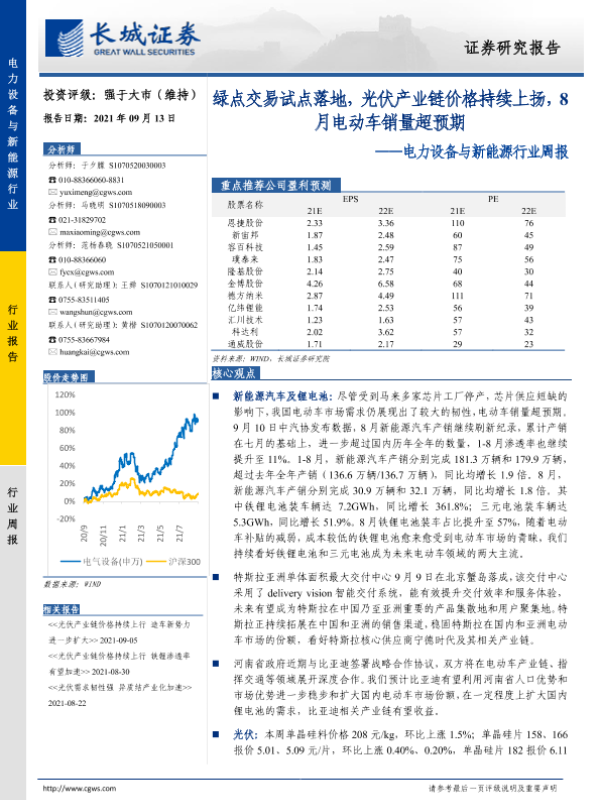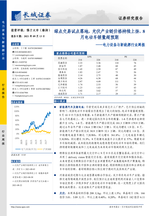 【长城证券】【20210913】20210913-长城证券-电力设备与新能源行业周报:绿点交易试点落地,光伏产业链价格持续上扬,8月电动车销量超预期-15页