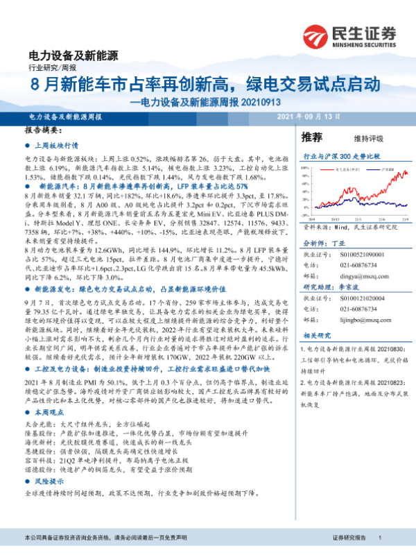 【民生证券】【20210913】电力设备及新能源周报:8月新能车市占率再创新高,绿电交易试点启动-24页