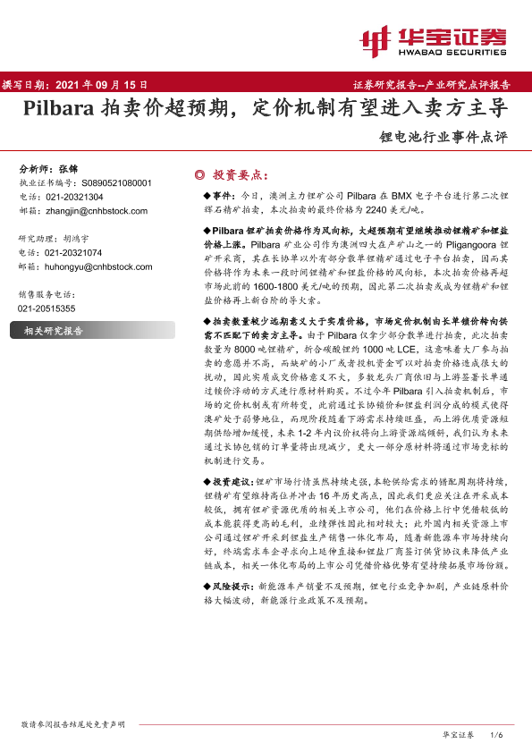 【华宝证券】【20210915】20210915-华宝证券-锂电池行业事件点评:Pilbara拍卖价超预期,定价机制有望进入卖方主导-6页