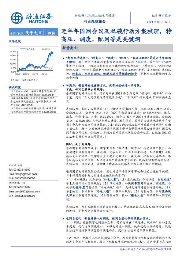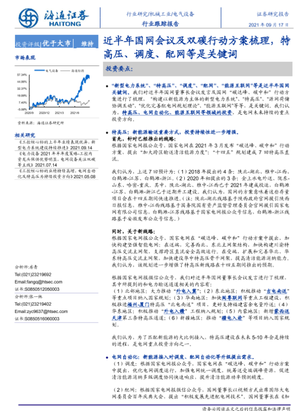 【海通证券】【20210917】电气设备行业跟踪报告:近半年国网会议及双碳行动方案梳理,特高压、调度、配网等是关键词-6页