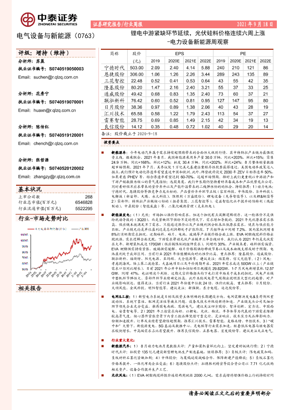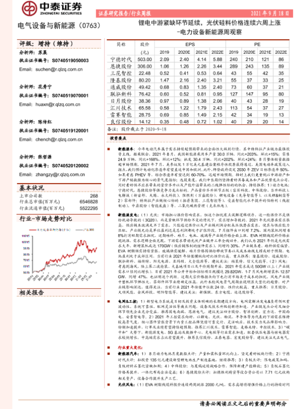 【中泰证券】【20210918】电力设备新能源周观察:锂电中游紧缺环节延续,光伏硅料价格连续六周上涨-21页