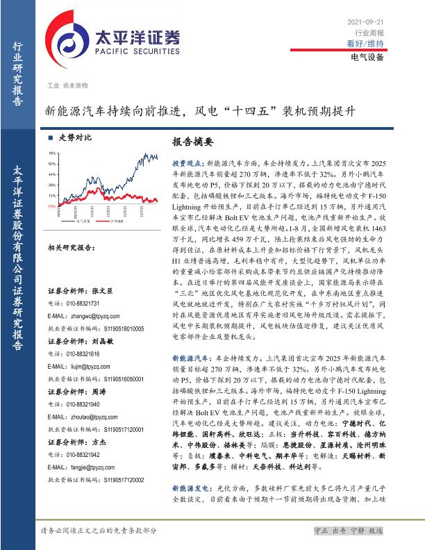 【太平洋证券】【20210921】20210921-太平洋-电气设备行业周报:新能源汽车持续向前推进,风电“十四五”装机预期提升-17页