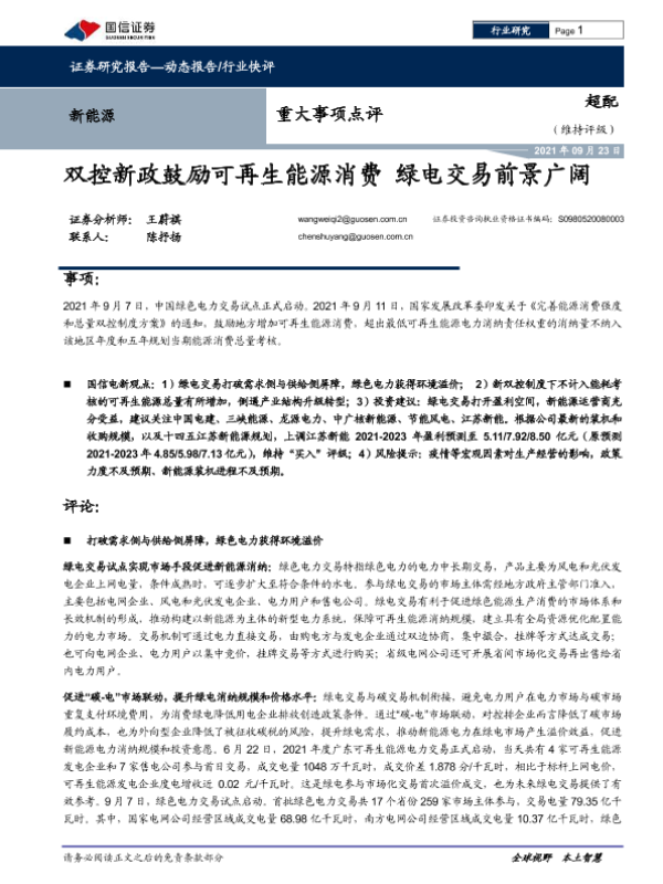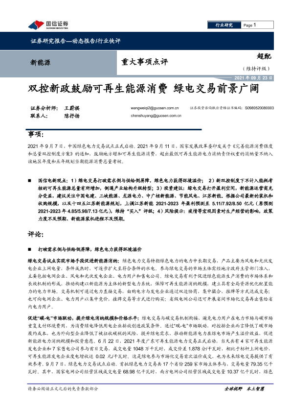 【国信证券】【20210923】20210923-国信证券-新能源重大事项点评:双控新政鼓励可再生能源消费 绿电交易前景广阔-7页