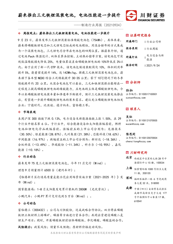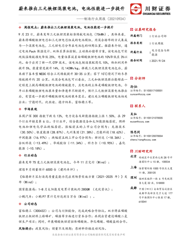 【川财证券】【20210924】制造行业周报:蔚来推出三元铁锂混装电池,电池性能进一步提升-13页
