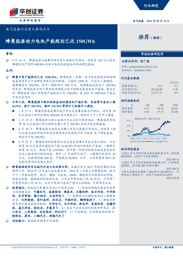 【华创证券】【20210925】电气设备行业重大事项点评:蜂巢能源动力电池产能规划已达150GWh-4页