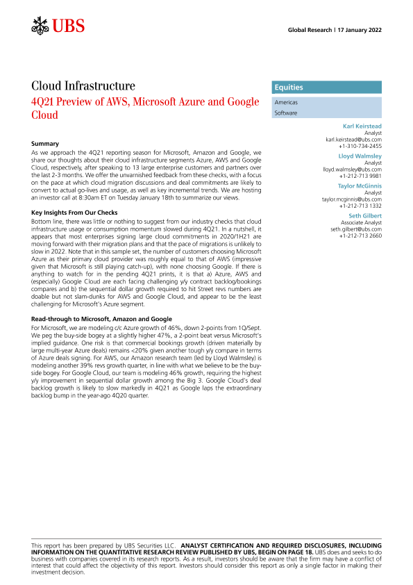 【瑞银】【20220117】瑞银-美股软件行业-2021第四季度预览:AWS,微软Azure和谷歌云-27页