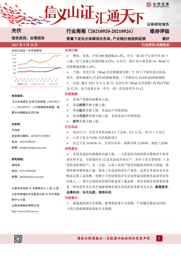 【山西证券】【20210926】20210926-山西证券-光伏行业周报:晋冀下发风光保障项目名单,产业链价格涨势延续-10页