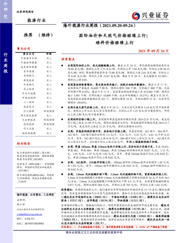 【兴业证券】【20210926】海外能源行业周报:国际油价和天然气价格继续上行;硅料价格继续上行-21页