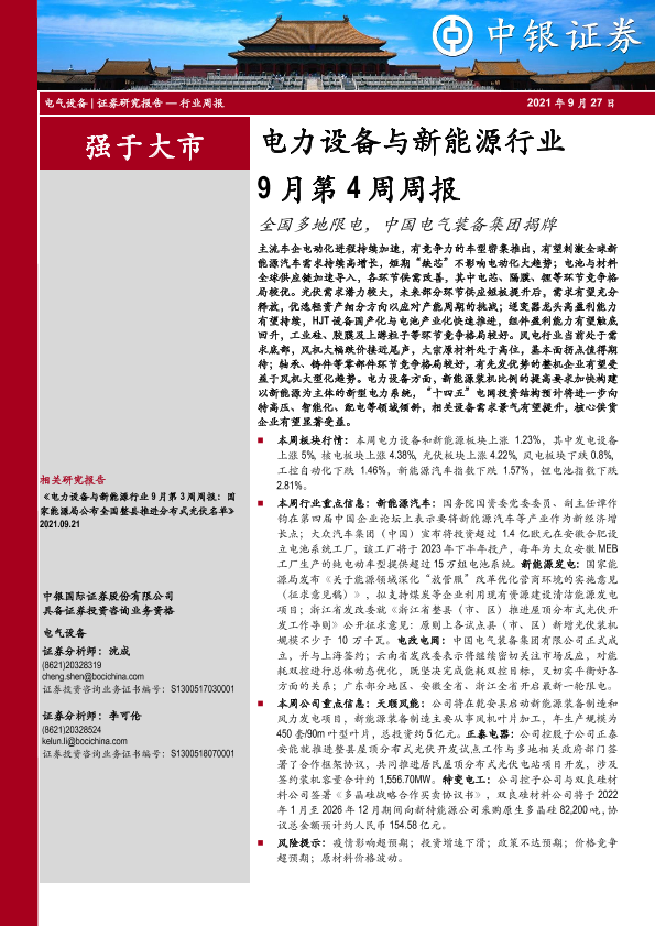 【中银证券】【20210927】电力设备与新能源行业9月第4周周报:全国多地限电,中国电气装备集团揭牌-14页