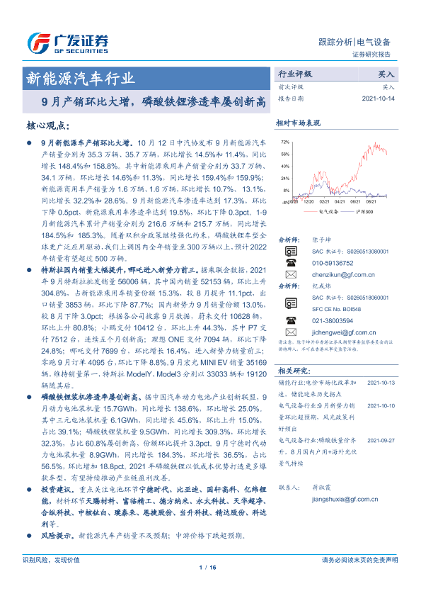 【广发证券】【20211014】新能源汽车行业:9月产销环比大增,磷酸铁锂渗透率屡创新高-16页