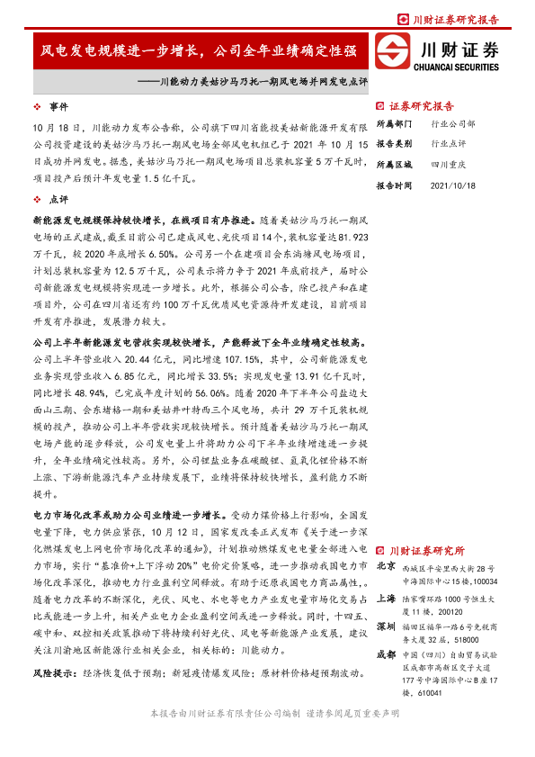【川财证券】【20211018】川能动力美姑沙马乃托一期风电场并网发电点评-5页