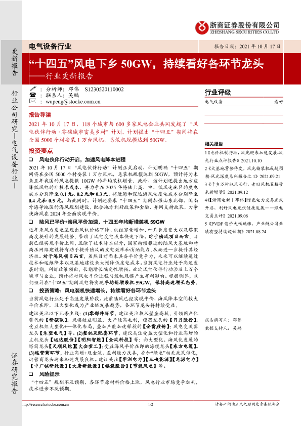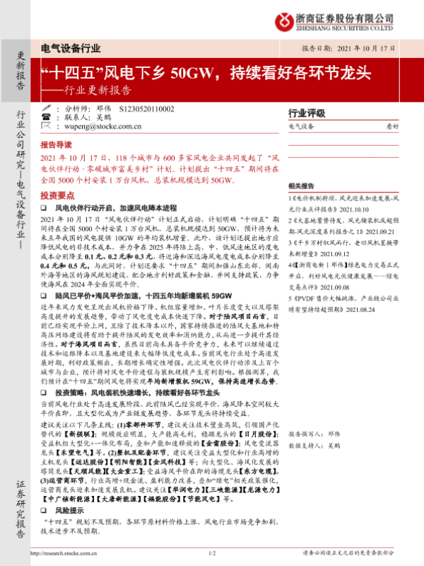 【浙商证券】【20211017】“十四五”风电下乡50GW,持续看好各环节龙头-2页