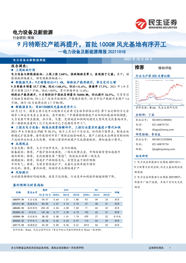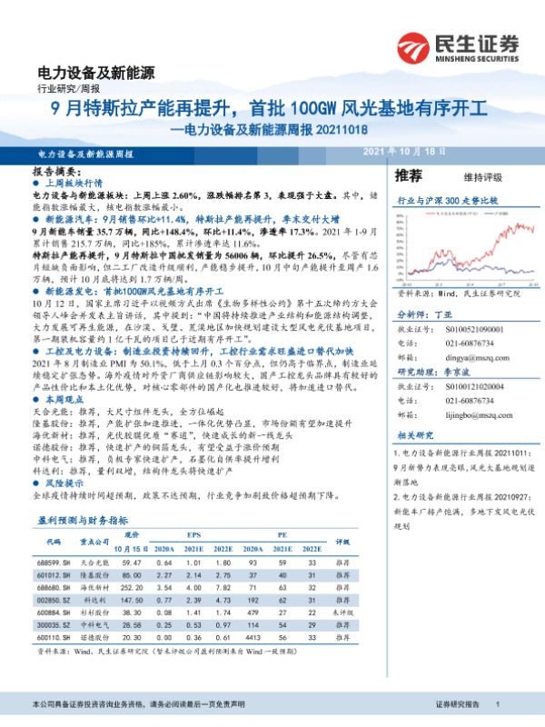 【民生证券】【20211018】电力设备及新能源周报:9月特斯拉产能再提升,首批100GW风光基地有序开工-22页