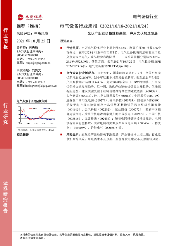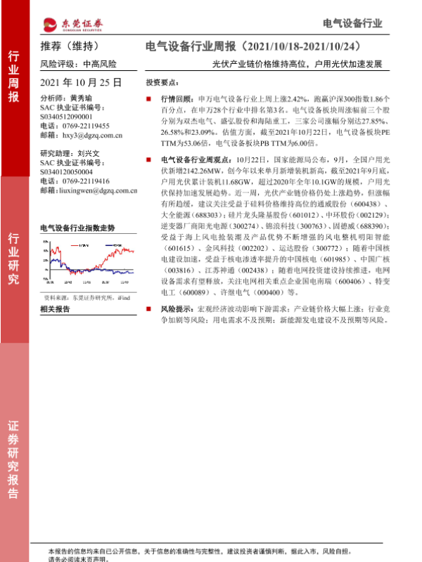 【东莞证券】【20211025】电气设备行业周报:光伏产业链价格维持高位,户用光伏加速发展-12页