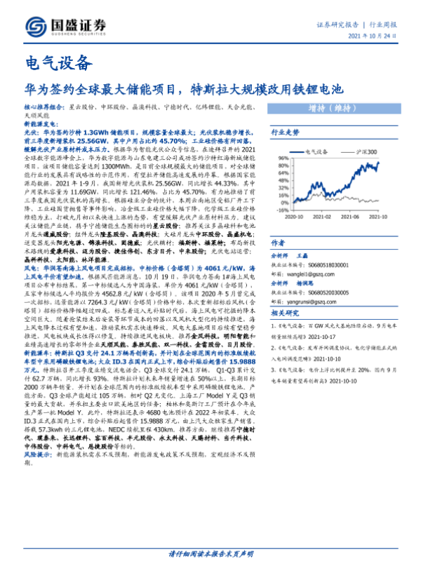 【国盛证券】【20211024】电气设备行业周报:华为签约全球最大储能项目,特斯拉大规模改用铁锂电池-16页
