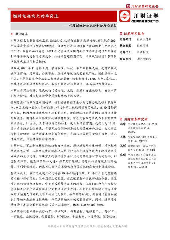 【川财证券】【20211029】科技制造行业先进制造行业周报:燃料电池向大功率突进-12页
