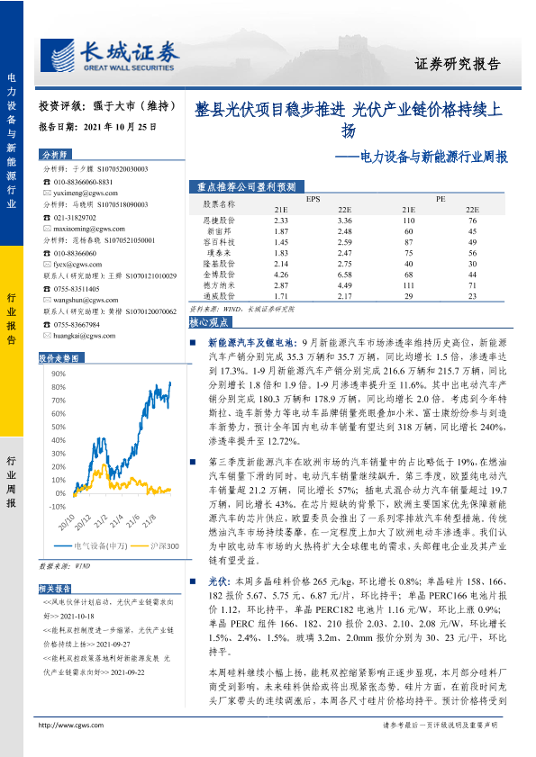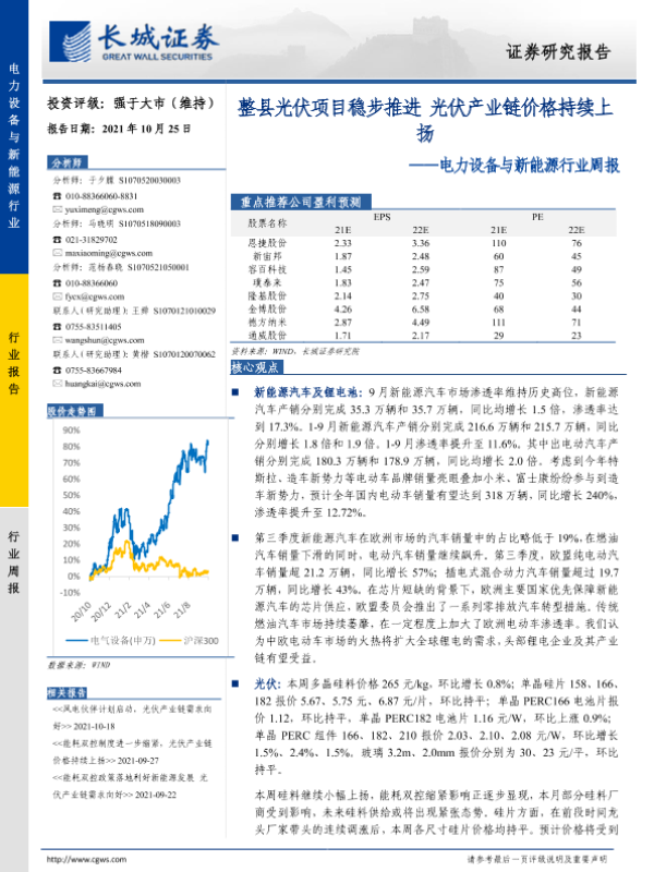 【长城证券】【20211025】20211025-长城证券-电力设备与新能源行业周报:整县光伏项目稳步推进 光伏产业链价格持续上扬-14页