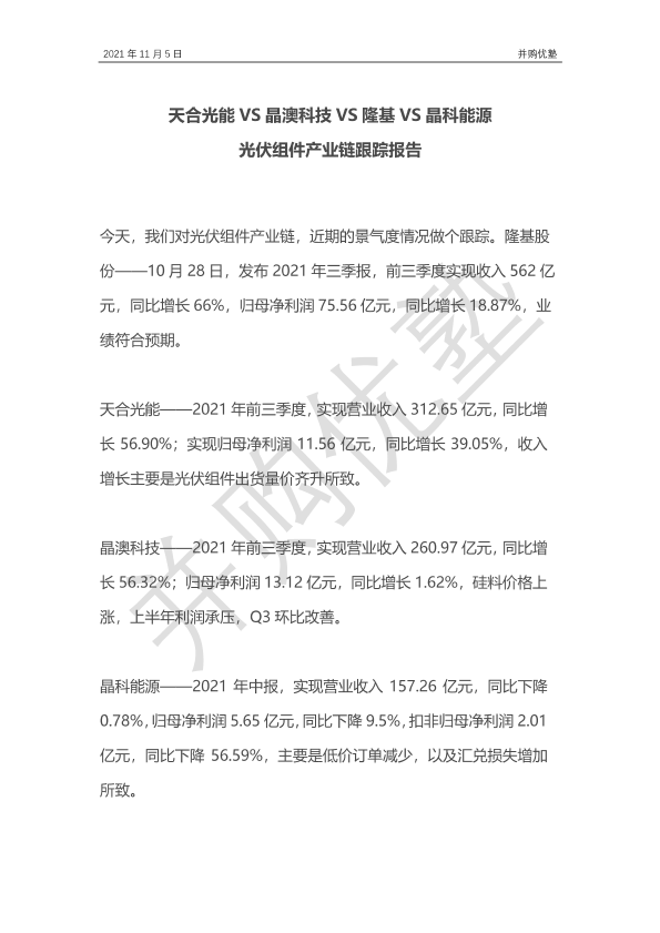 【并购优塾】【20211105】天合光能VS晶澳科技VS隆基VS晶科能源:光伏组件产业链跟踪报告-24页