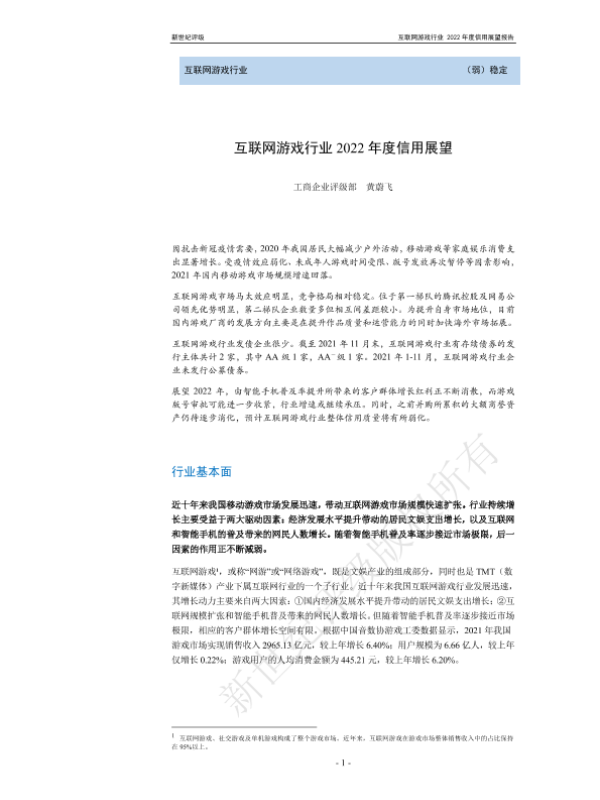 【新世纪评级】【20220101】互联网游戏行业2022年度信用展望-15页