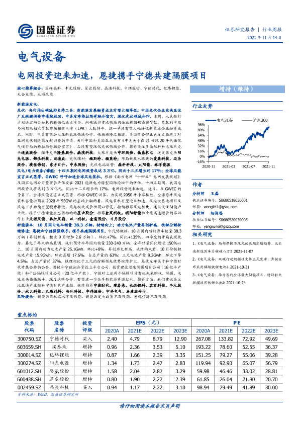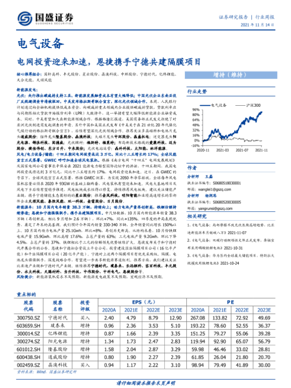 【国盛证券】【20211115】电气设备行业周报:电网投资迎来加速,恩捷携手宁德共建隔膜项目-14页