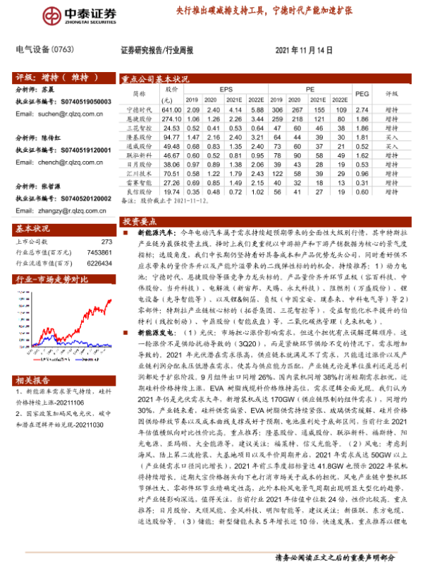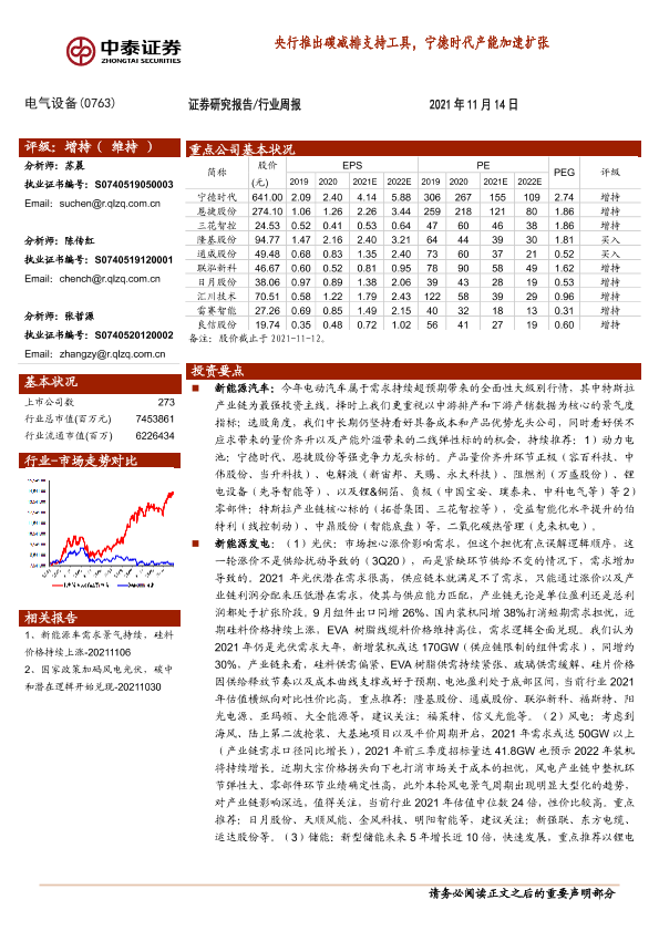 【中泰证券】【20211114】电气设备行业周报:央行推出碳减排支持工具,宁德时代产能加速扩张-21页
