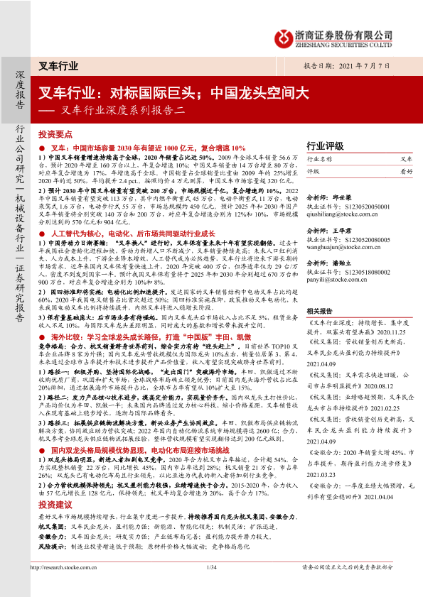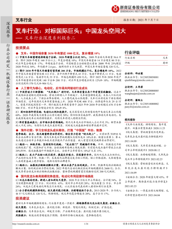 【浙商证券】【20210707】叉车行业深度系列报告二:对标国际巨头,中国龙头空间大-34页