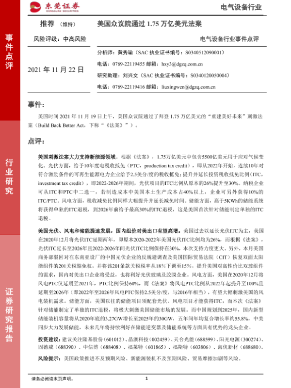 【东莞证券】【20211122】电气设备行业事件点评:美国众议院通过1.75万亿美元法案-2页