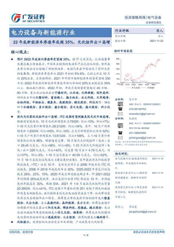 【广发证券】【20211122】电力设备与新能源行业:22年底新能源车渗透率或超35%,光伏组件出口高增-4页