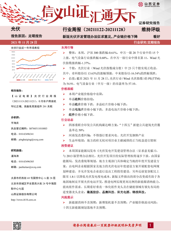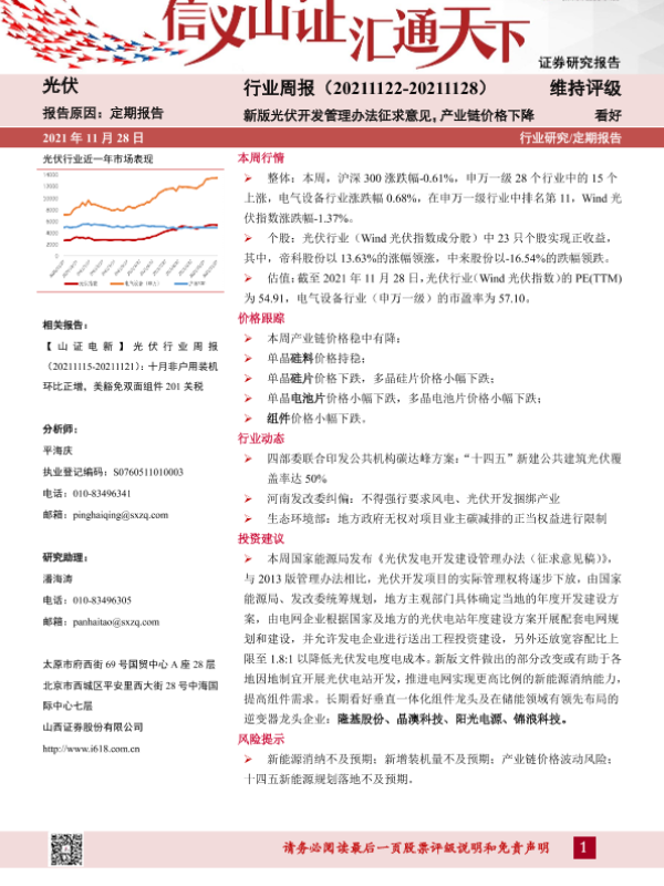 【山西证券】【20211128】20211128-山西证券-光伏行业周报:新版光伏开发管理办法征求意见,产业链价格下降-11页