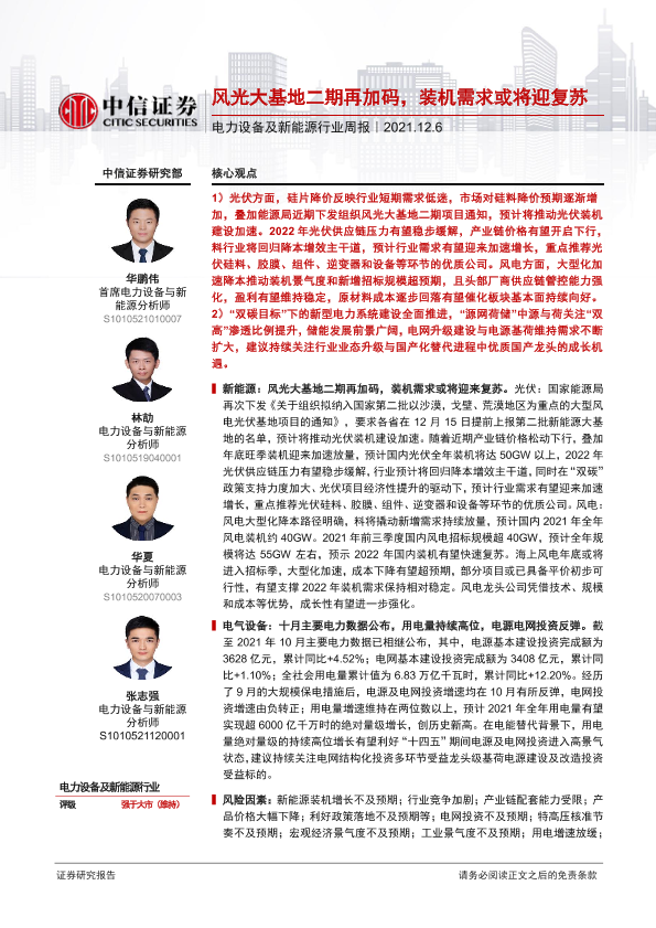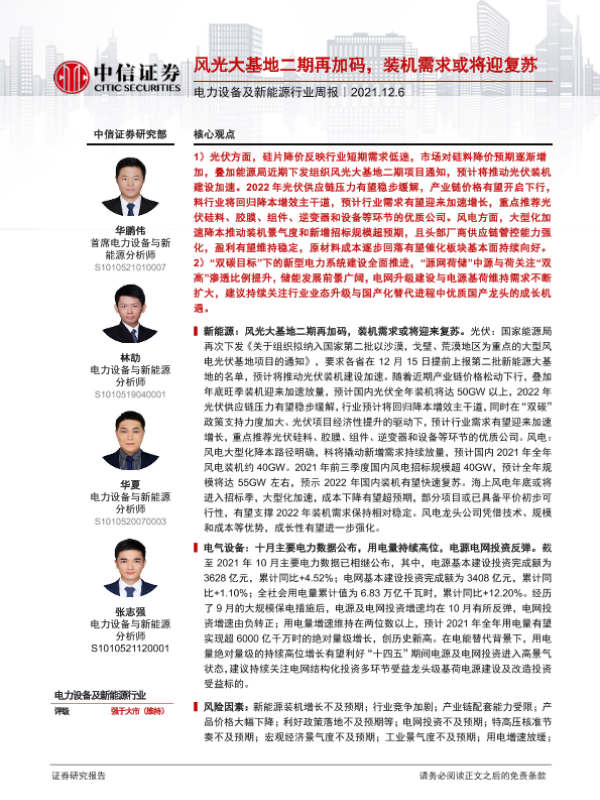 【中信证券】【20211206】电力设备及新能源行业周报:风光大基地二期再加码,装机需求或将迎复苏-11页